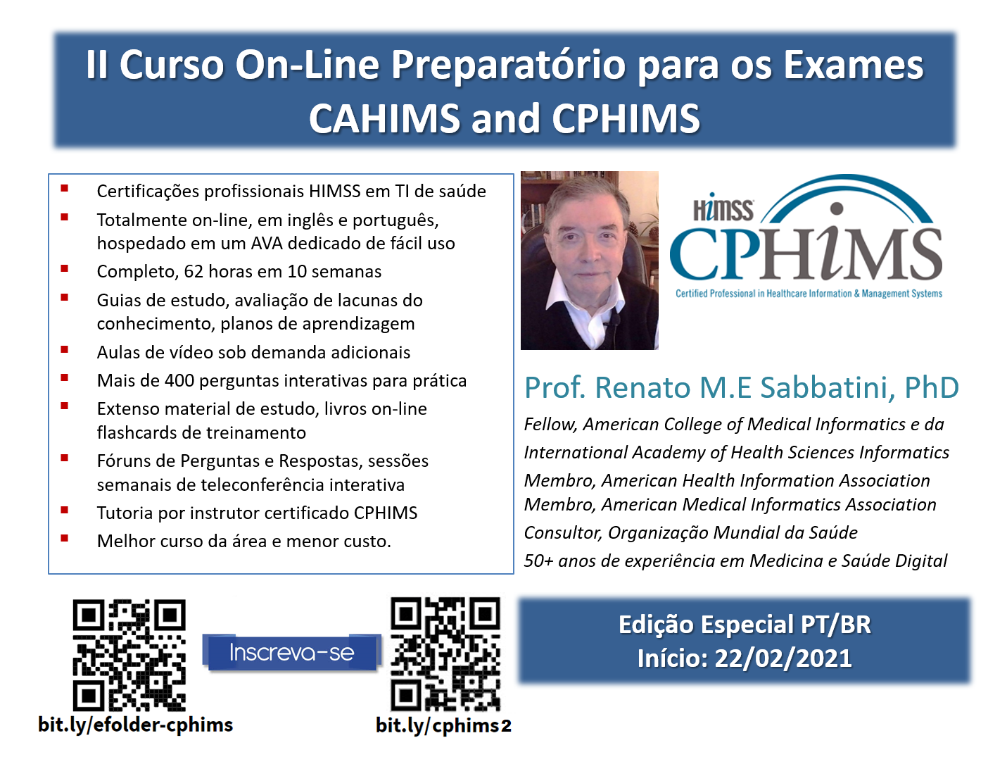 Sabe de qual estou falando? CPHIMS: Certified Professional em Health Information Management and Systems! Concedido pela HIMSS para pessoas com pelo menos cinco anos de experiência, sendo três na área de saúde, e um diploma de nível superior, e passar em um difícil exame de avaliação do conhecimento na área, com 100 questões em duas horas! Um curso de preparação é essencial, portanto.