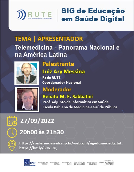 HOJE 27/9 20:00h BRT: Palestra gratuita: Telemedicina: Panorama Nacional e na América Latina - Dr. Luiz Ary Messina (Presidente ABTMS e Coordenador RUTE)